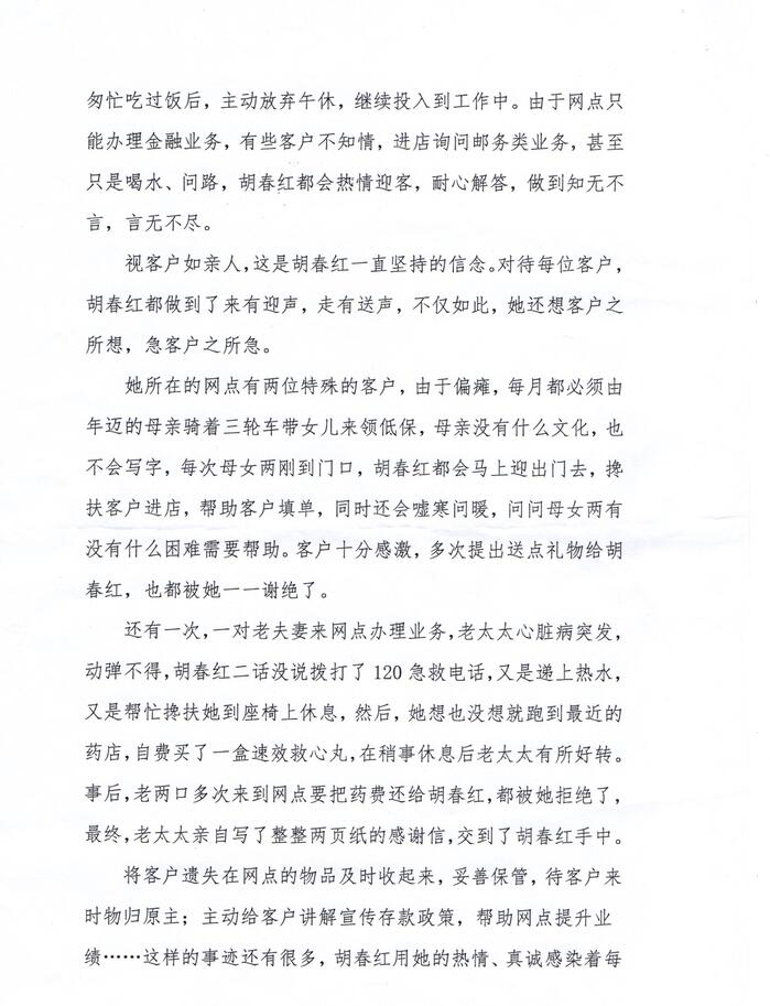 還有一次,一對老夫妻來網點辦理業(yè)務,老大大心臟病突發(fā),動彈不得,胡春紅二話沒說撥打了120急救電話,又是遞上熱水又是幫忙攙扶她到座椅上休息,然后,她想也沒想就跑到最近的藥店,自費買了一盒速效救心丸,在稍事休息后老太大有所好轉事后,老兩口多次來到網點要把藥費還給胡春紅,都被她拒絕了,最終,老大大親自寫了整整兩頁紙的感謝信,交到了胡春紅手中。將客戶遺失在網點的物品及時收起來,妥善保管,待客戶來時物歸原主;主動給客戶講解宣傳存款政策,幫助網點提升業(yè)績……這樣的事跡還有很多,胡春紅用她的熱情、真誠感染著每一位前來辦理業(yè)務的客戶。翻開客戶意見薄,里面密密麻麻地記載了客戶對于胡春紅的贊美與好評,每當想到自已的努力可以真正幫助到客戶,滿滿的成就感就會在胡春紅的心頭漾開,而這也成了她堅持下去的動力。“我在這里上班,我就是這的一份子,我愿意盡我的微薄之力,讓網點辦得更好!”這是胡春紅的心里話,雖然樸實,卻很感人,一如她在這平凡的崗位上,干出的不平凡的成績!